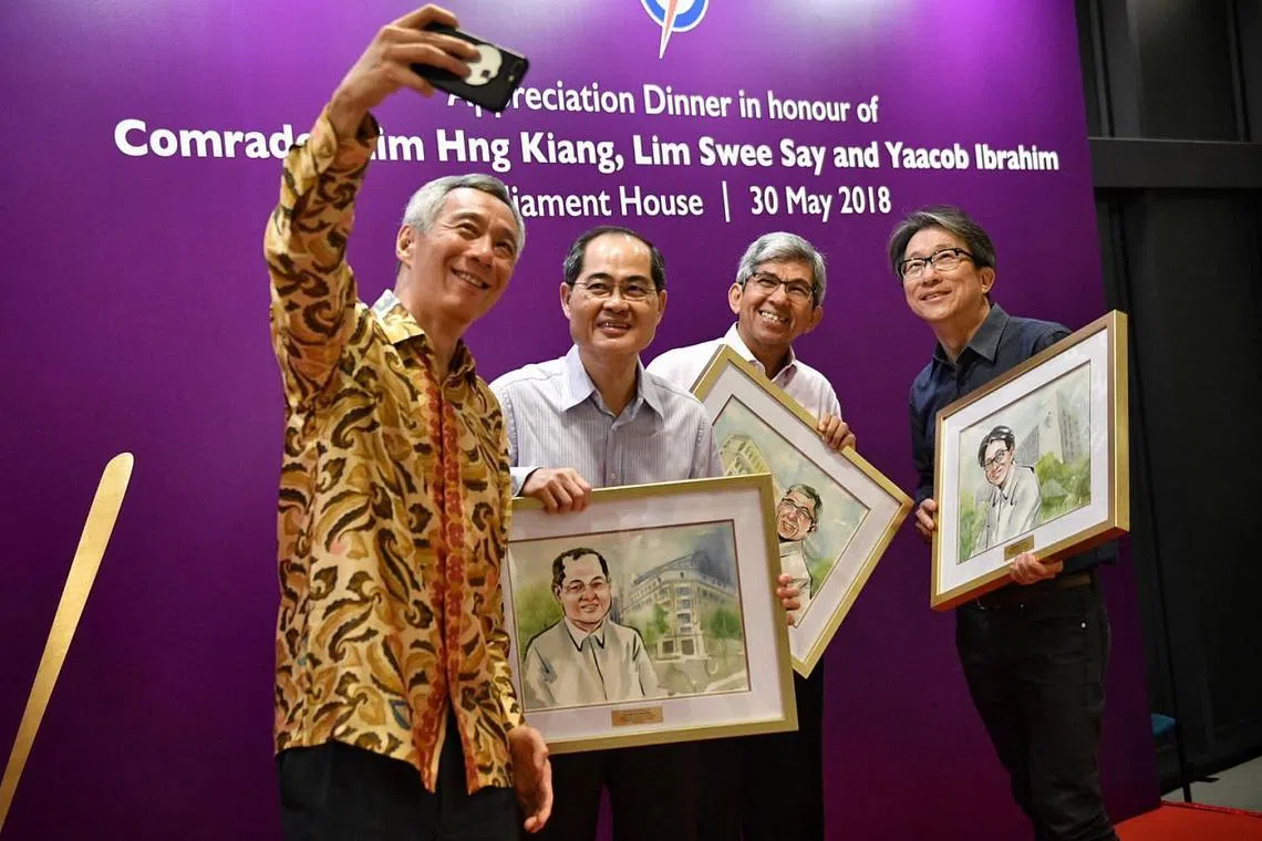 TERIMA KASIH: (Dari kiri) Encik Lee, Encik Lim Hng Kiang, Dr Yaacob Ibrahim dan Encik Lim Swee Say merakam gambar bersama di majlis makan malam yang bertujuan memberi penghargaan kepada tiga menteri Kabinet yang baru bersara itu. - Foto-foto BH oleh ARIFFIN JAMAR -