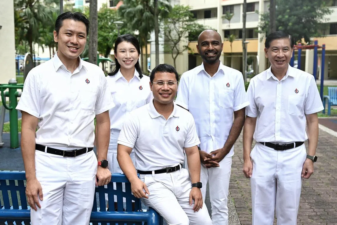 Pasukan Parti Tindakan Rakyat yang akan bertanding di GRC West Coast-Jurong West pada GE2025. (Dari kiri) Encik Shawn Huang; Cik Cassandra Lee; Menteri Pembangunan Negara, Encik Desmond Lee; Dr Hamid Razak dan Encik Ang Wei Neng.