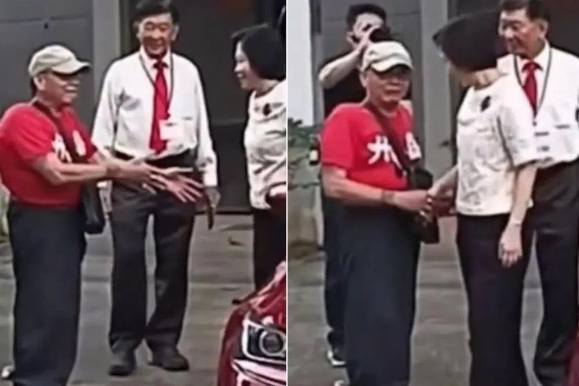 Lelaki yang memakai kemeja-T merah lalu membantu Cik Gan menutup pintu kereta sebelum menghulurkan tangannya untuk berjabat tangan.