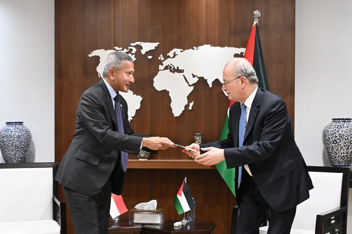 Dr Balakrishnan (kiri) menyampaikan undangan rasmi kepada Perdana Menteri Penguasa Palestin, Encik Mohammad Mustafa untuk datang ke Singapura semasa kededua pemimpin itu bertemu di pejabat perdana menteri di Ramallah. - Foto BH oleh AZMI ATHNI