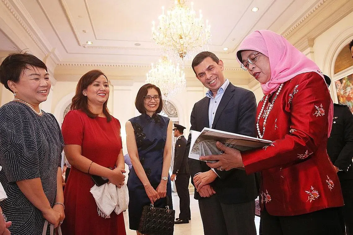 SEJARAH MONUMEN NEGARA: (dari kiri) Pengurus Besar Straits Times Press, Cik Susan Long; koresponden ST dan editor buku Monumental Treasures: Singapore's Heritage Icons, Cik Melody Zaccheus; CEO NHB, Cik Chang Hwee Nee; dan Encik Warren Fernandez sama-sama menyaksikan Presiden Halimah Yacob membaca buku Monumental Treasures: Singapore's Heritage Icons semasa majlis pelancaraannya di Istana semalam. - Foto BH oleh GAVIN FOO -
