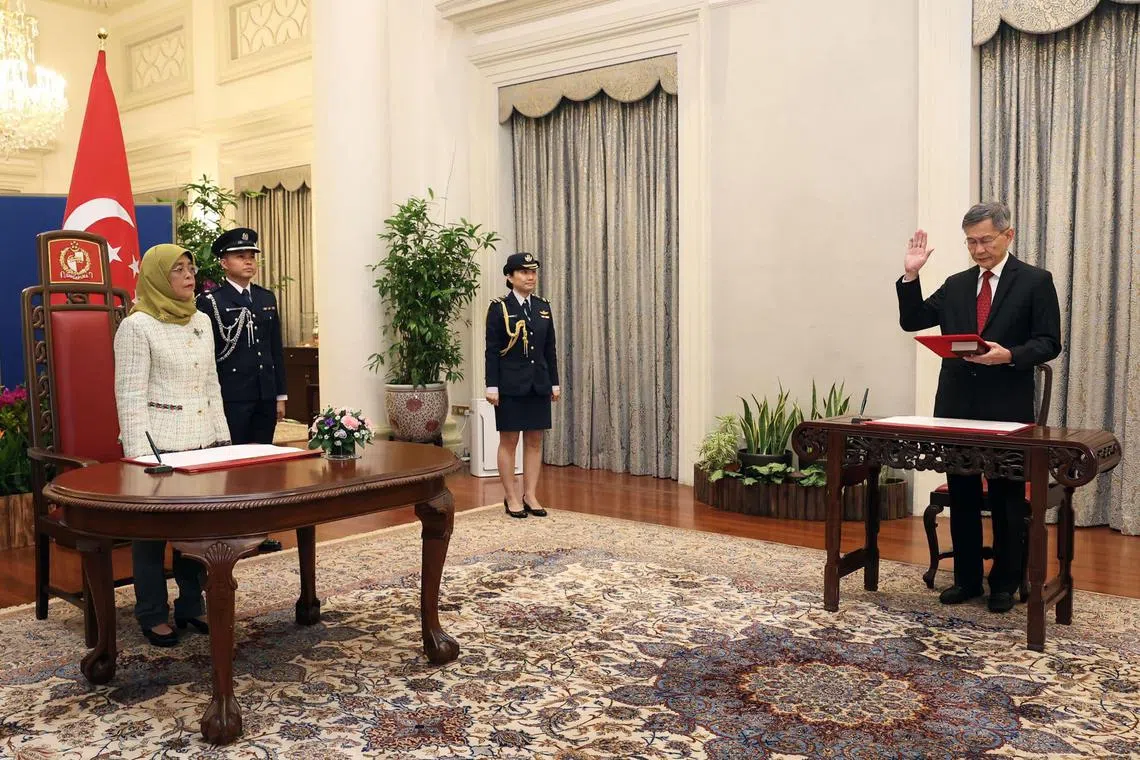 Presiden Halimah Yacob (kiri) telah merasmikan upacara angkat sumpah bagi pelantikan Encik Tan Siong Thye Lawrence (kanan) sebagai hakim kanan Mahkamah Agung Singapura.