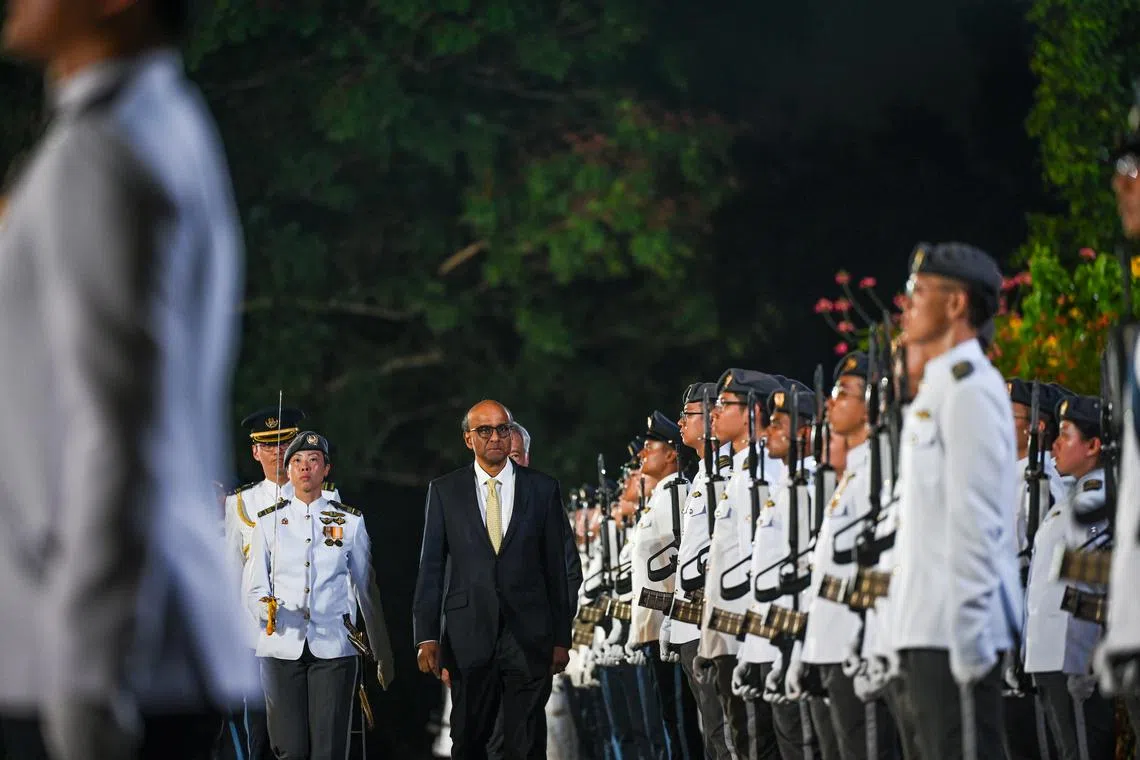PEMERIKSAAN PERTAMA: Pemeriksaan Pengawal pertama oleh Presiden Tharman Shanmugaratnam. Kontinjen tersebut terdiri daripada anggota-anggota tentera, tentera udara dan pihak polis Singapura.