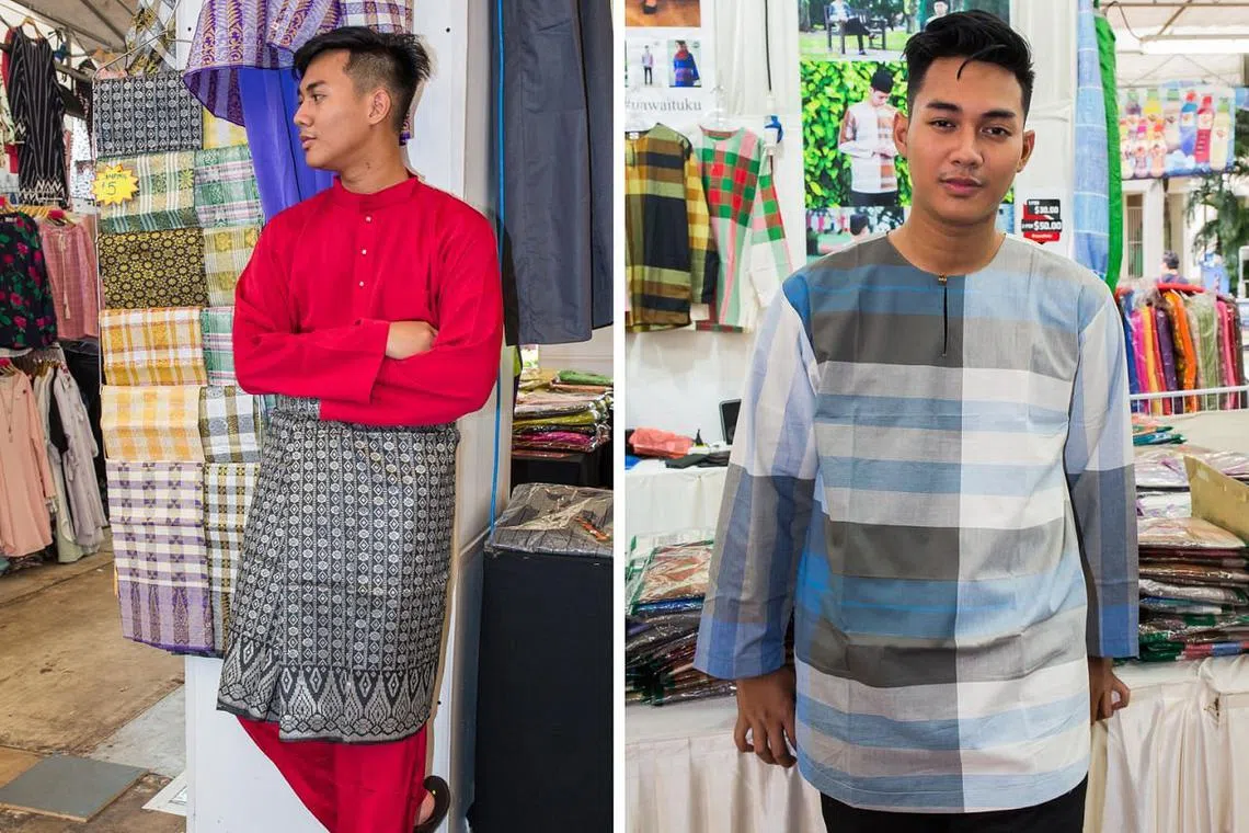 MENIMBANG PILIHAN: Encik Muhammad Iman mencuba baju Melayu di gerai A'niz (kiri) dan baju yang diilhamkan daripada kain pelekat di gerai Nawaituku (kanan). - Foto-foto ZALEHA ABDUL KADER -