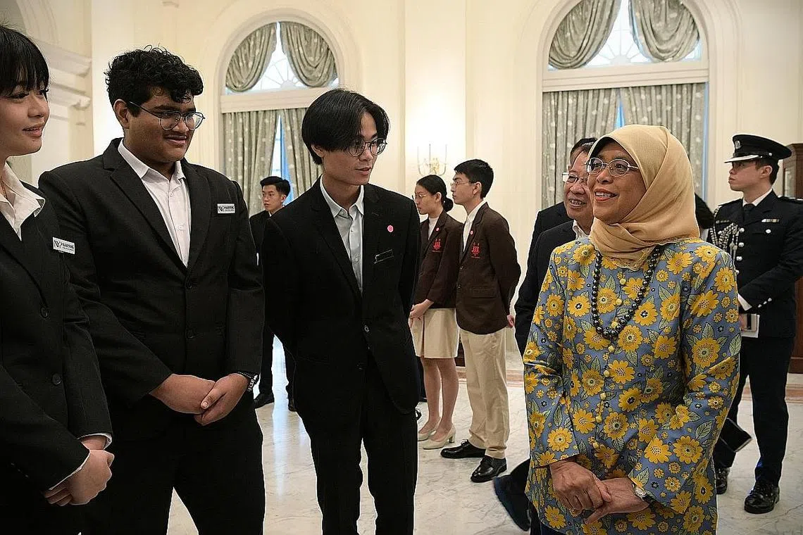 SUMBANGAN BELIA: Presiden Halimah berinteraksi dengan Pejuang Keharmonian yang baru dilantik di bawah program Pejuang Keharmonian Yayasan Temasek-Roses of Peace, (dari kiri) Cik Cheryln Yang, Encik Vickneswaran Somu Thevar Ramadoss dan Encik Blaise Kwok dari Politeknik Nanyang di Istana. - Foto ST