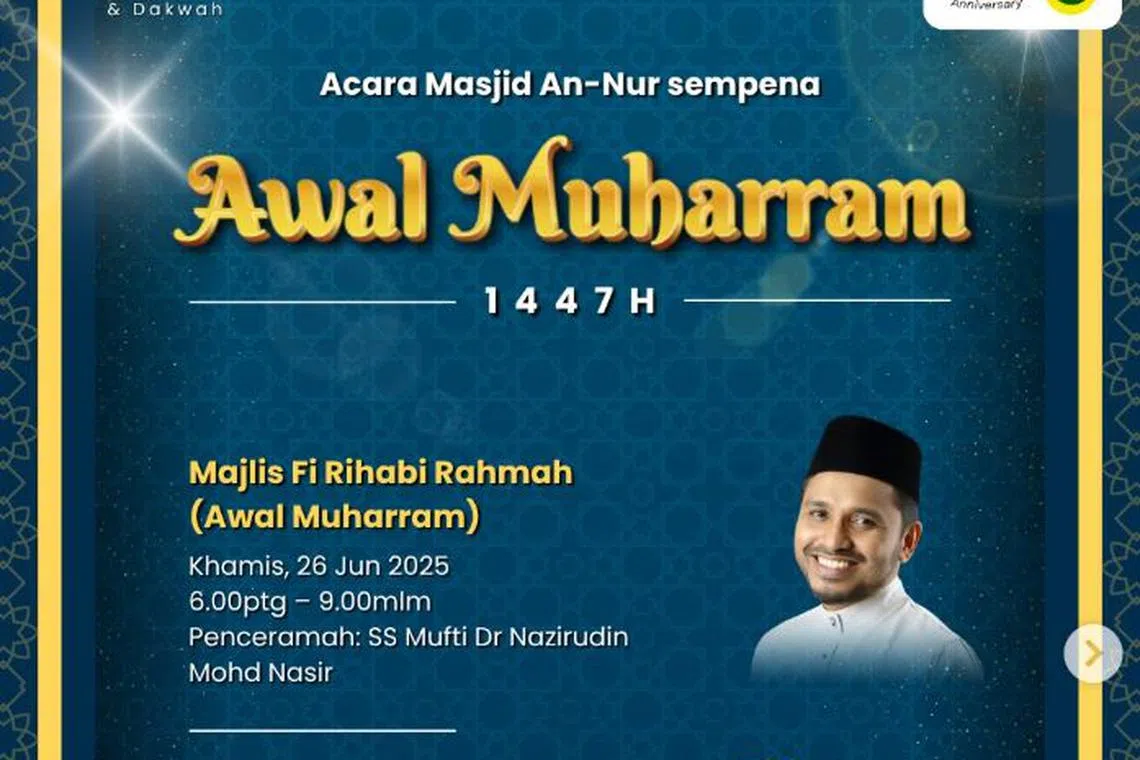 Majlis Ma’al Hijrah 1447H di Masjid Sultan pada 26 hingga 27 Jun menampilkan zikir munajat, bacaan Yasin dan tahlil, doa akhir dan awal tahun Hijrah, tausiyah oleh asatizah tempatan, serta qiamullail dan kuliah sebelum subuh, lengkap dengan jamuan makan malam dan sarapan pagi.