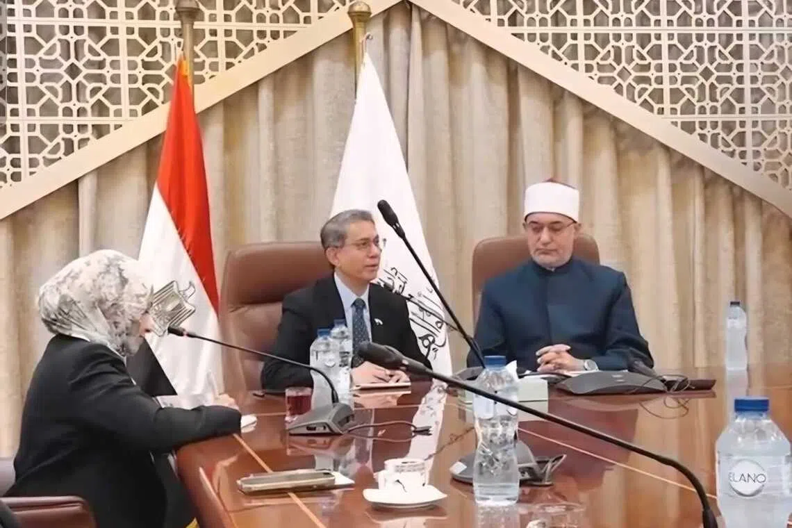 Pemangku Menteri Bertanggungjawab bagi Ehwal Masyarakat Islam merangkap Menteri Negara Kanan (Ehwal Dalam Negeri), Profesor Madya Dr Muhammad Faishal Ibrahim (dua dari kanan) bertemu dengan Mufti Besar Mesir, Dr Nazir Mohamed Ayyad (kanan); dan Presiden Universiti Al-Azhar, Dr Salama Dawood, semasa lawatan kerja beliau ke Kahirah, Mesir, yang berlangsung dari 31 Oktober hingga 2 November. - Foto TANGKAP LAYAR FACEBOOK PROFESOR MADYA DR MUHAMMAD FAISHAL IBRAHIM