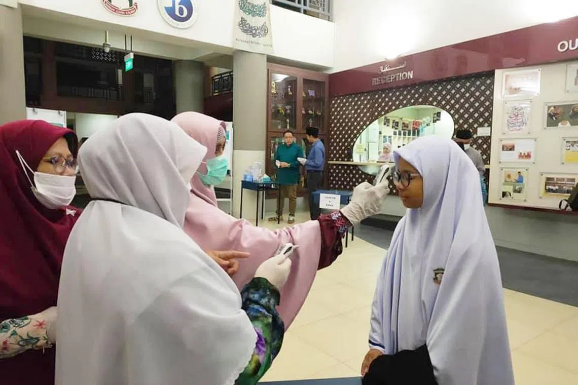 Misalnya di Madrasah Aljunied Al-Islamiah, suhu badan kesemua lebih 500 pelajar telah diambil beramai-ramai seawal 6:30 pagi sebelum sekolah bermula.