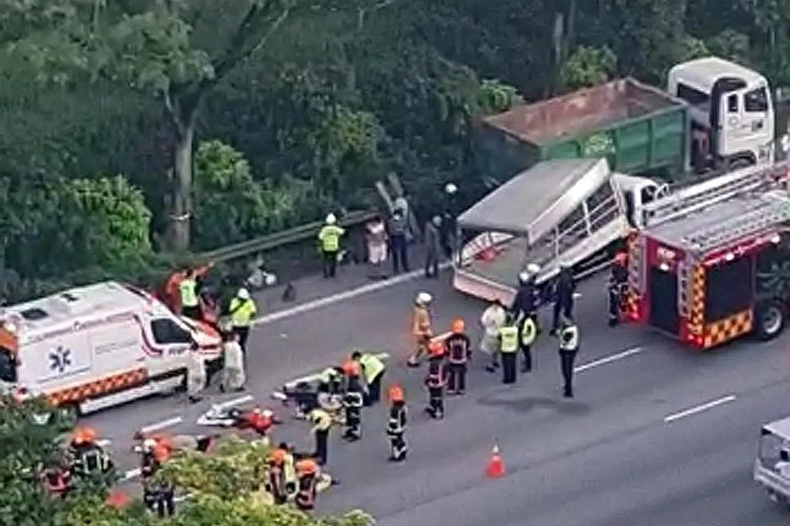 Polis diberitahu tentang kemalangan itu sekitar 6 pagi pada Selasa lalu. Pasukan Pertahanan Awam Singapura (SCDF) berkata dua orang terperangkap di bahagian belakang lori itu dan diselamatkan menggunakan peralatan hidraulik.