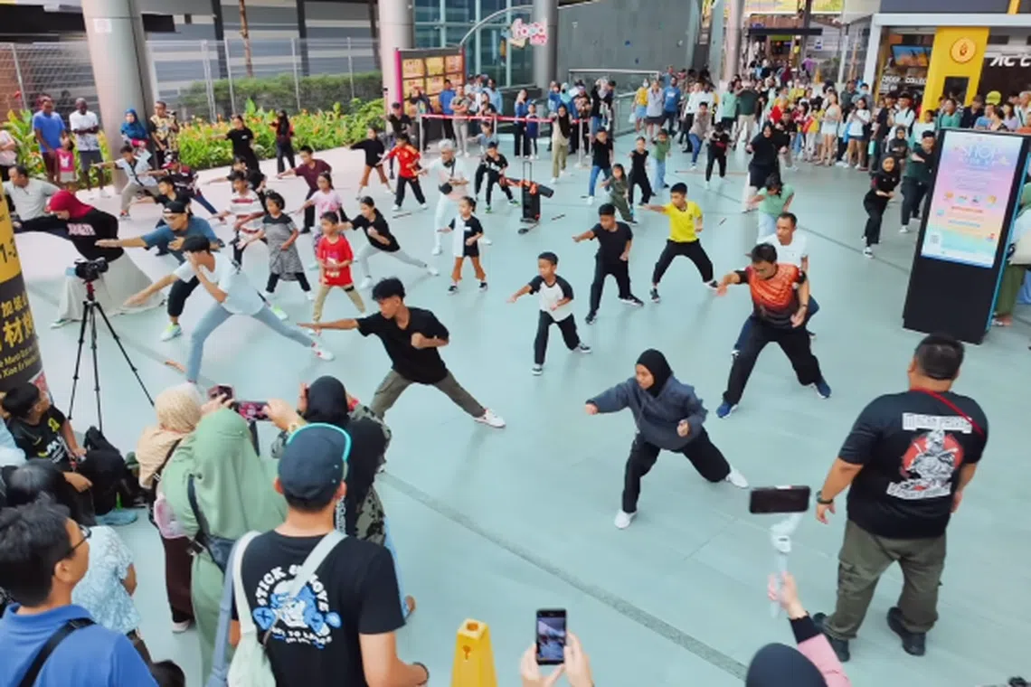 Persembahan itu menunjukkan orang ramai memerhatikan dan memetik gambar sekumpulan pesilat di ruang awam antara Lot One dengan ruang masuk stesen MRT Choa Chu Kang.