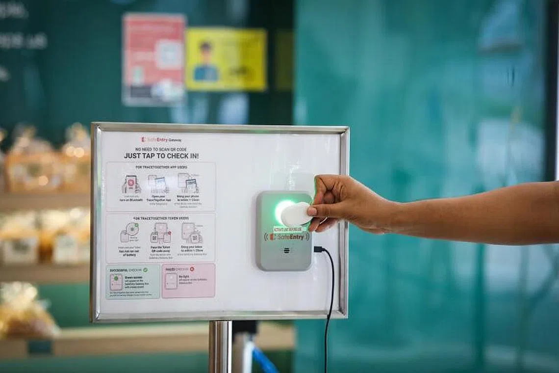 Orang ramai kini boleh menggunakan token TraceTogether atau telefon dengan aplikasi TraceTogether pada alat-alat ini bagi mendaftarkan butiran peribadi mereka dalam setiap kunjungan untuk tujuan jejak kontak.