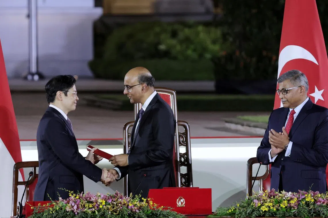 Perdana Menteri, Encik Lawrence Wong (kiri), menerima watikah pelantikan daripada Presiden Tharman Shanmugaratnam semasa majlis angkat sumpah di Istana pada 15 Mei, sambil disaksikan Ketua Hakim Sundaresh Menon. - Foto fail