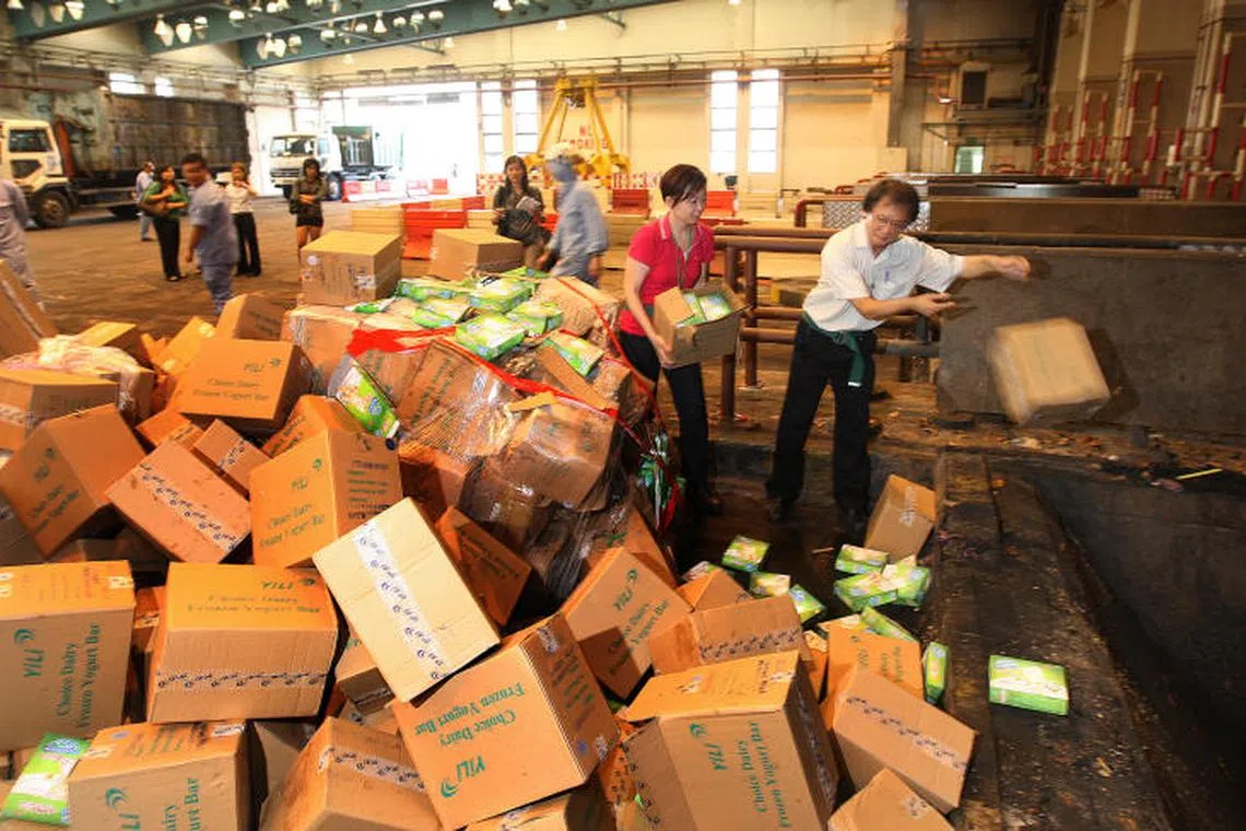 BUANG PRODUK TERCEMAR: Dalam gambar fail yang dirakam pada September 2008 ini, pegawai Penguasa Pertanian-Makanan dan Ternakan (AVA) dilihat membuang sekitar 500 karton produk tenusu Yili yang didapati mengandungi melamin ke dalam insinerator di Tuas.