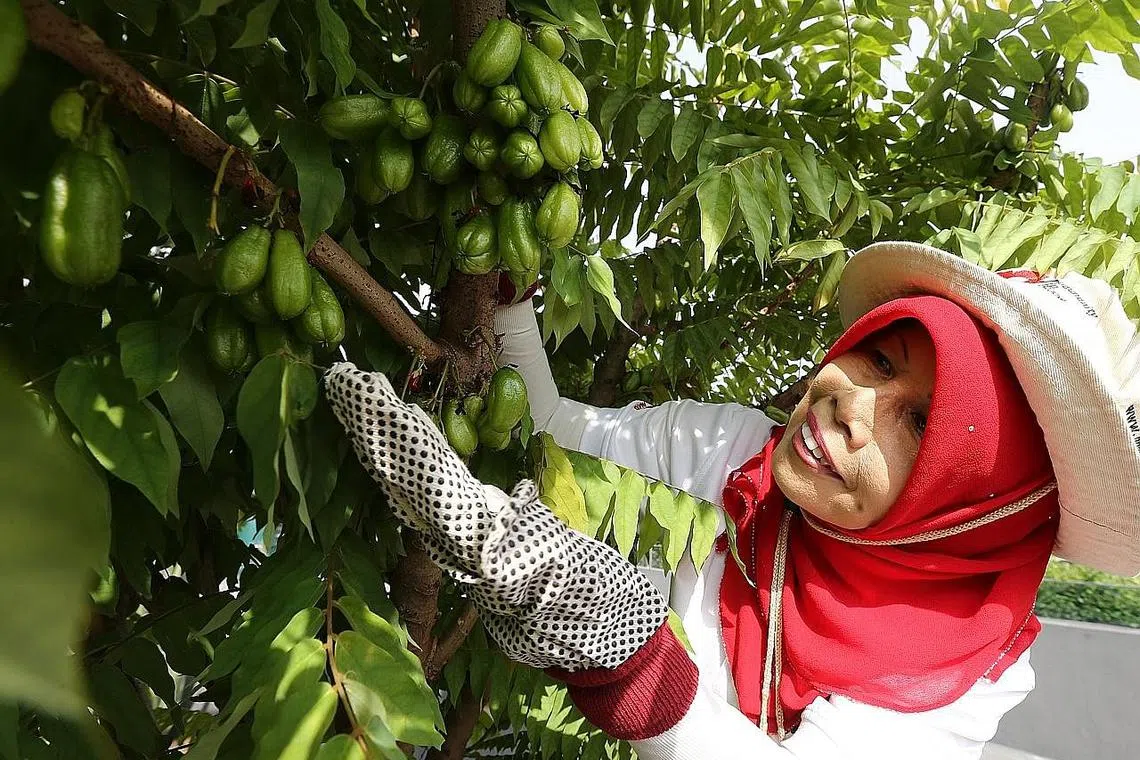 TIADA yang lebih menggembirakan Cik Salbiah Osman daripada melihat orang ramai, termasuk golongan berpendapatan rendah, menerima hasil tanaman daripada kebun masyarakat-eko di Our Tampines Hub.