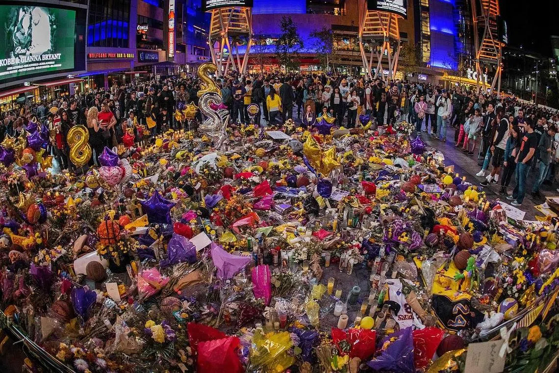 Koleksi barangan yang diletakkan di LA Live Entertainment Centre termasuk bunga, lilin, belon, karya seni, foto, jersi, bola jaring dan anak patung.