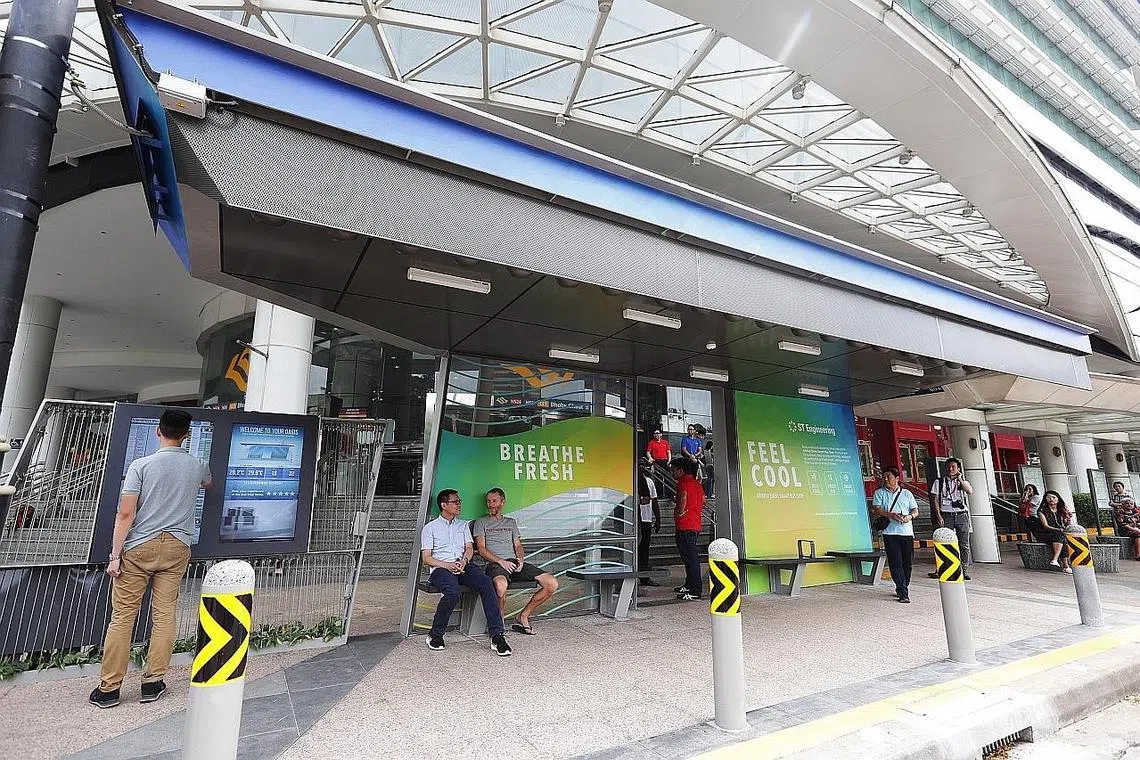 Perhentian bas percubaan yang dibangunkan oleh syarikat ST Engineering, menampilkan saluran di bawah bumbung yang boleh mengeluarkan udara sejuk serendah 24 darjah Celsius dan dikatakan 90 peratus lebih bersih, dengan zarah bahaya PM2.5 ditapis.