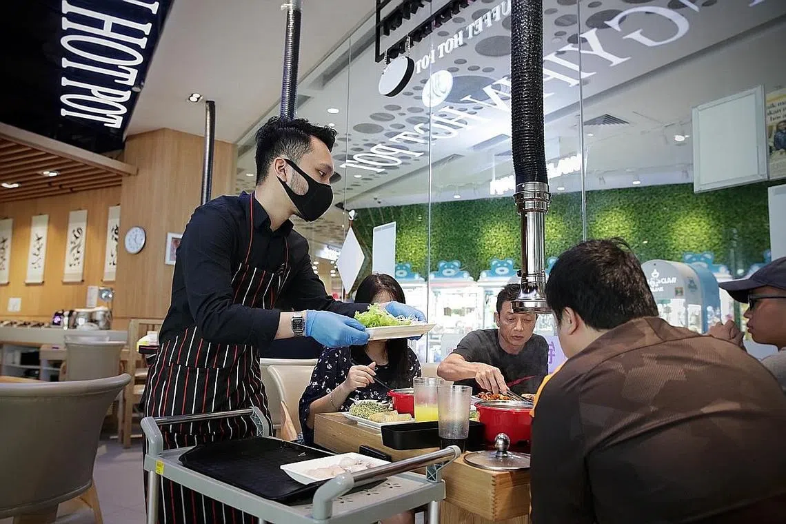 ATUR CARA SELAMAT: Pelayan di restoran Jinshangyipin Buffet Hot Pot dilihat memakai sarung tangan, menyediakan makanan terlebih dahulu dan menyajikannya ke meja makan pelanggan. Restoran itu menerapkan khidmat bufet di meja sejak ia memulakan semula operasi pada 26 Jun lalu. - Foto BH oleh GIN TAY -