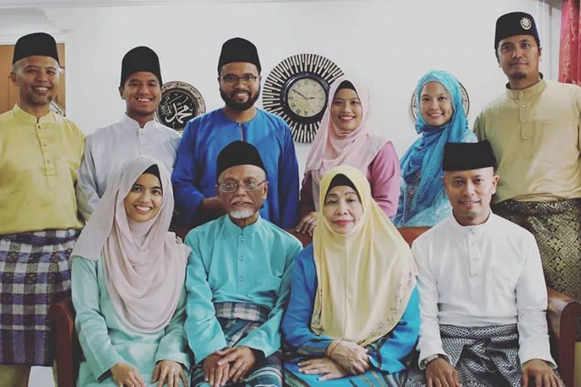 MASIH SIHAT: Ustaz Pasuni (depan, dua dari kiri) dan isterinya Cik Siti Zaliha Mat Amin (depan, dua dari kanan) tetap dalam keadaan sihat sehingga kini. Gambar ini diambil pada 1 Syawal lalu bersama kelapan-lapan anaknya termasuk Cik Nadirah (depan, kiri) dan Encik Ahmad Hilmy (depan, kanan), serta (berdiri dari kiri) Encik Zulkhairi, Encik Irfan, Encik Afif, Cik Dianah, Cik Nazihah dan Ustaz Syakir. - Foto FACEBOOK SYAKIR ABU FAROUQ -