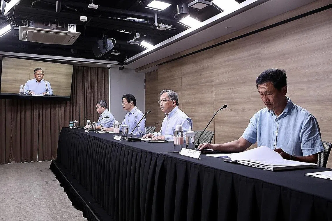 PERKEMBANGAN TERKINI: (Dari kiri) Pengarah khidmat perubatan Singapura, Profesor Madya Kenneth Mak bersama pengerusi bersama Pasukan Bertindak Berbilang Kementerian (MTF) Covid-19 yang juga Menteri Kewangan Encik Lawrence Wong, Menteri Perdagangan dan Perusahaan, Encik Gan Kim Yong dan Menteri Kesihatan, Encik Ong Ye Kung dalam sidang media semalam. - Foto MCI -