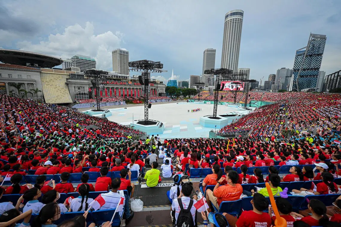 SAMBUTAN GAH: ‘Lautan’ merah putih membanjiri Padang pada 8 Julai lalu apabila lebih 16,000 murid Darjah 5 menyaksikan Pertunjukan Pendidikan Nasional (NE) Perbarisan Hari Kebangsaan (NDP). - Foto-foto BH oleh SHAFIQ APANDI