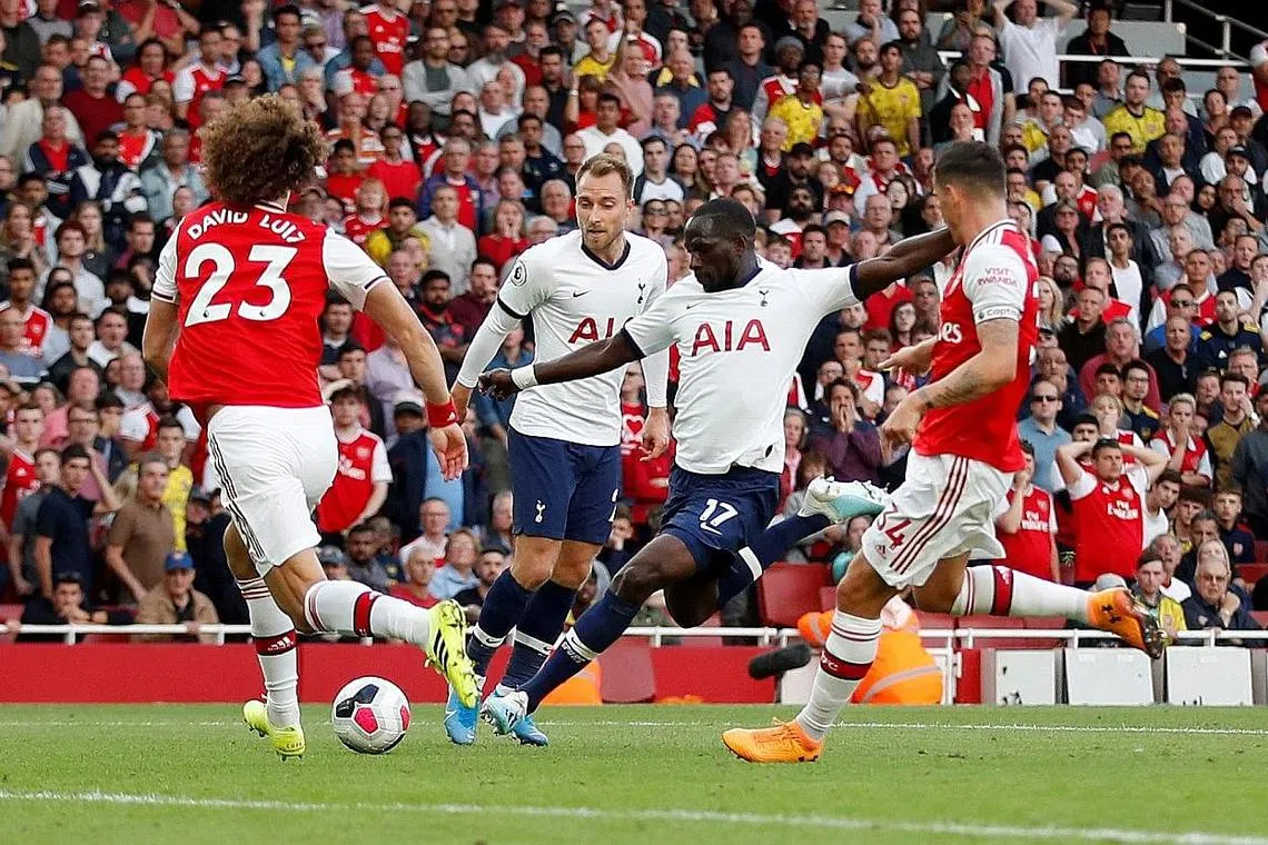 TIDAK LEPASKAN PELUANG: Pemain tengah pasukan Tottenham Hotspur, Moussa Sissoko, cuba merembat bola di depan gawang Arsenal sambil disaksikan pemain sepasukan, Christian Eriksen, manakala pemain pertahanan Arsenal, David Luiz (jersi nombor 23) dan pemain sepasukan, Granit Xhaka, cuba menghalang percubaan itu dalam perlawanan berkesudahan 2-2 di Holloway, London, kelmarin. - Foto REUTERS -