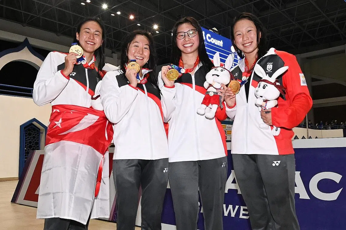 Pasukan berganti-ganti campuran 4x100 meter wanita - yang terdiri daripada Faith Khoo, Letitia Sim, Quah Jing Wen dan Quah Ting Wen - menyempurnakan malam Singapura pada hari terakhir persaingan renang menggondol emas dan sekali gus memecah rekod temasya sukan dengan catatan masa 4:06.97.