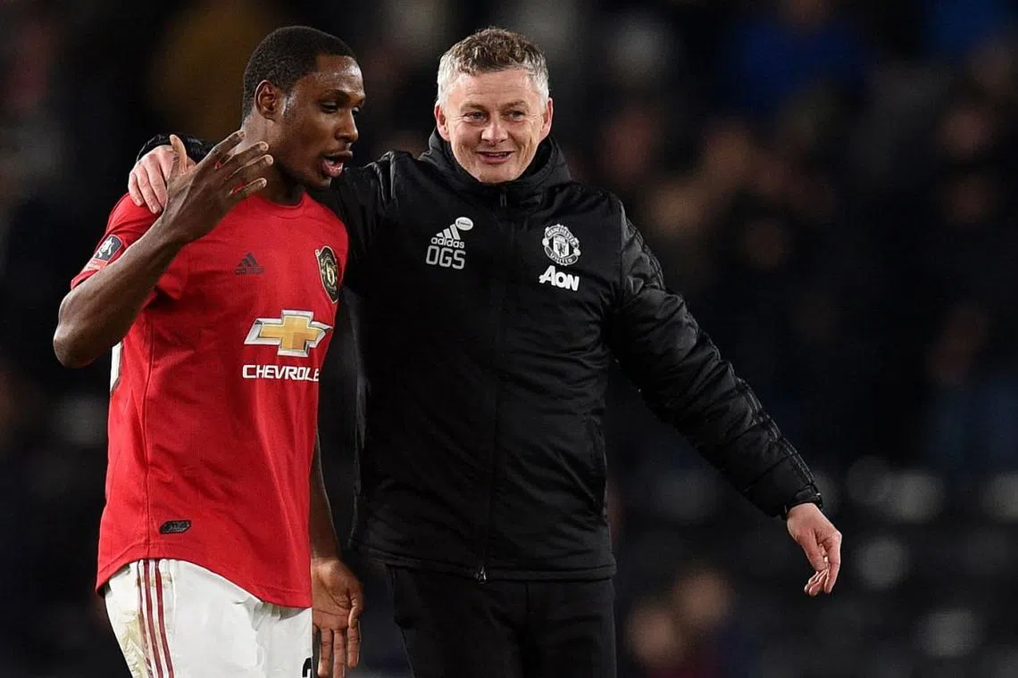 WAJAH BAHAGIA: Pengurus kelab Manchester United asal Norway, Ole Gunnar Solskjaer (kanan) bercakap dengan pemain penyerang pasukannya, Odion Ighalo, di akhir perlawanan pusingan kelima kejohanan Piala FA di mana Red Devils mengalahkan Derby County 0-3 di Stadium Pride Park di Derby, tengah England, kelmarin. - Foto AFP -