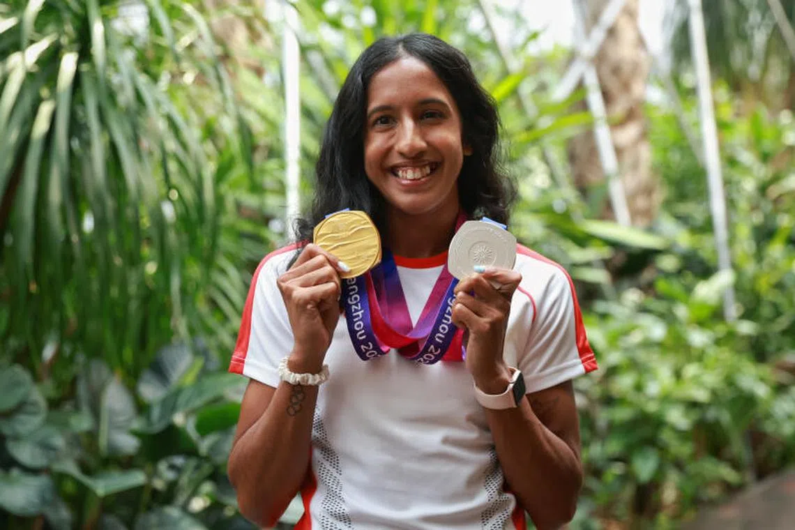 BERSEJARAH: Pelari pecut Shanti Pereira menang pingat emas dan perak di Sukan Asia Hangzhou, iaitu pingat pertama Singapura bagi sukan olahraga dalam temasya sukan itu sejak 1974. Beliau ditemui pihak media sejurus tiba di Lapangan Terbang Changi pada Khamis. - Foto ST