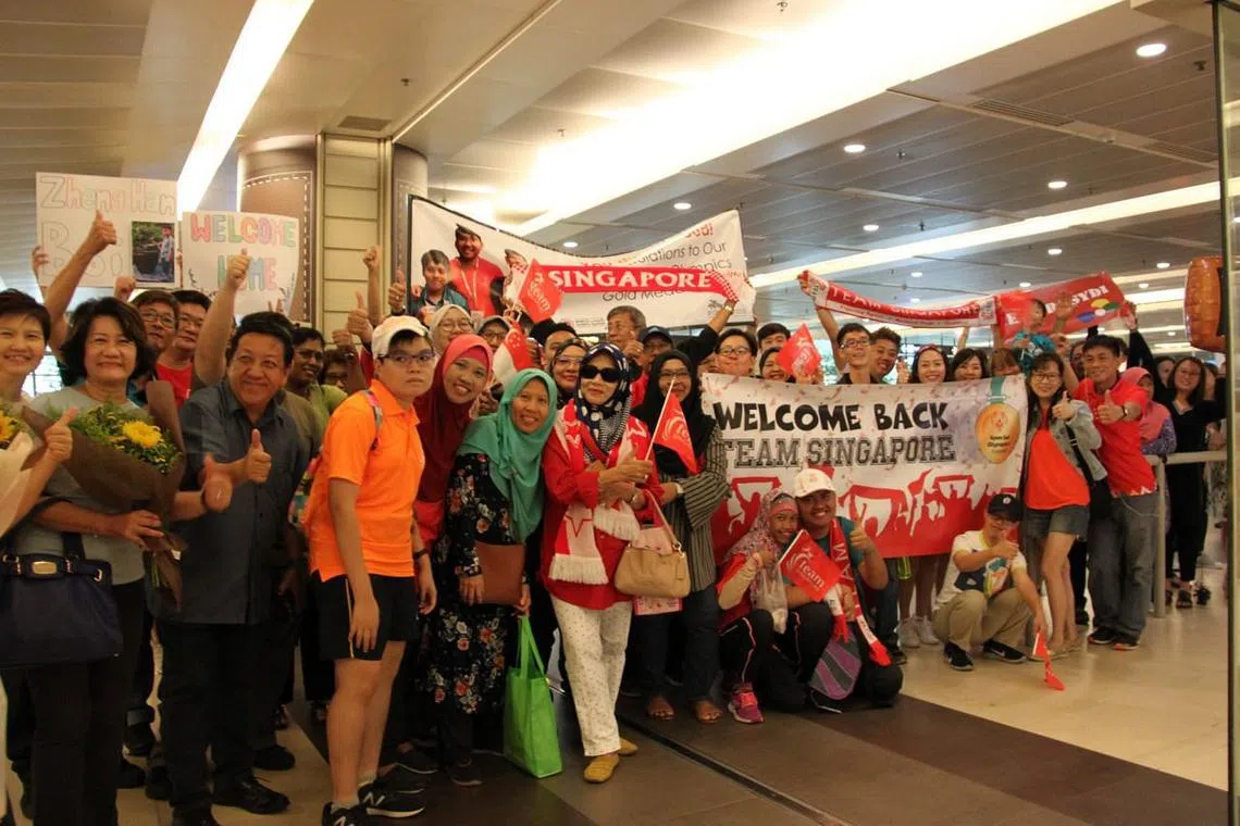 KEPULANGAN 30 atlit Team Singapore yang menyertai Sukan Olimpik Khas disambut meriah di Lapangan Terbang Changi pagi tadi (23 Mac) oleh penyokong dan anggota keluarga mereka.