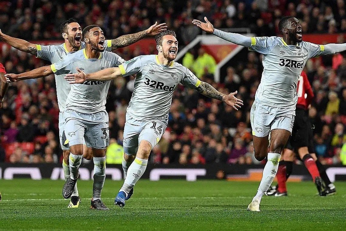 RAIKAN GOL: Penyerang Derby, Jack Marriott (tengah) meraikan gol kedua pasukannya ketika menentang Manchester United pagi semalam. Derby menewaskan Manchester United yang beraksi 10 orang 8-7 dalam penentuan penalti untuk menempah tempat ke kelompok 16 terakhir Piala Liga. - Foto AFP -