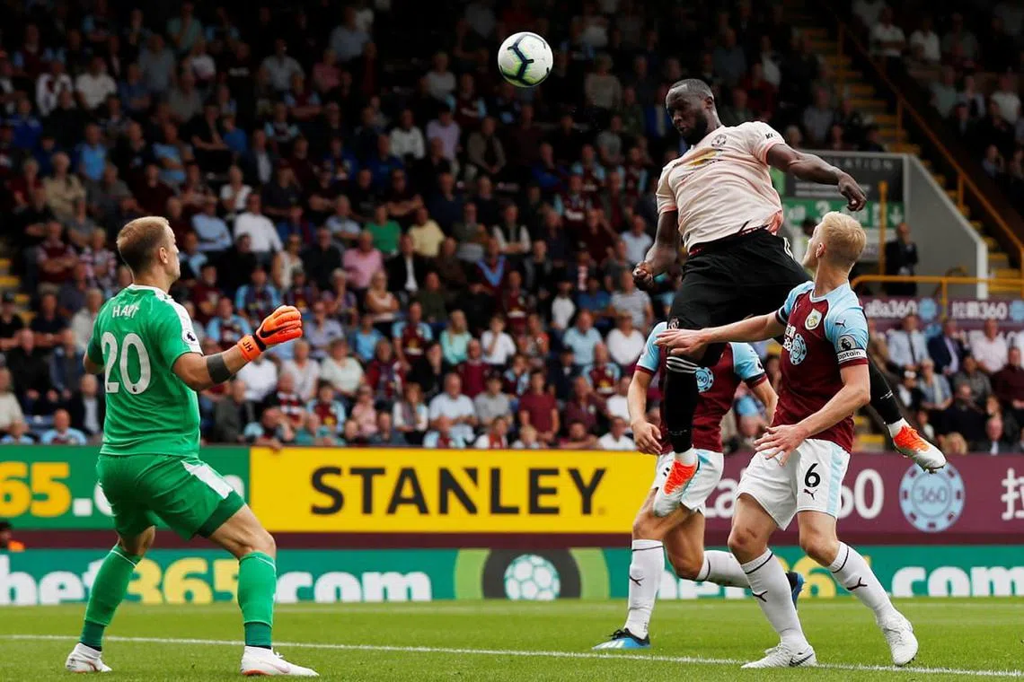 TANDUKAN HEBAT: Lukaku, menanduk masuk bola ke gawang Burnley yang hanya dapat dilihat oleh pemain pertahanan lawan, Ben Mee (kanan) dan penjaga gawang, Joe Hart (kiri). - Foto REUTERS -