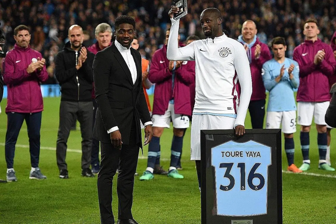 JASA DIKENANG: Sumbangan Yahya Toure (kanan), yang akan meninggalkan kelab itu di penghujung musim ini mendapat penghargaan City yang turut mengundang abang pemain itu, Kolo Toure (kiri). - Foto AFP -