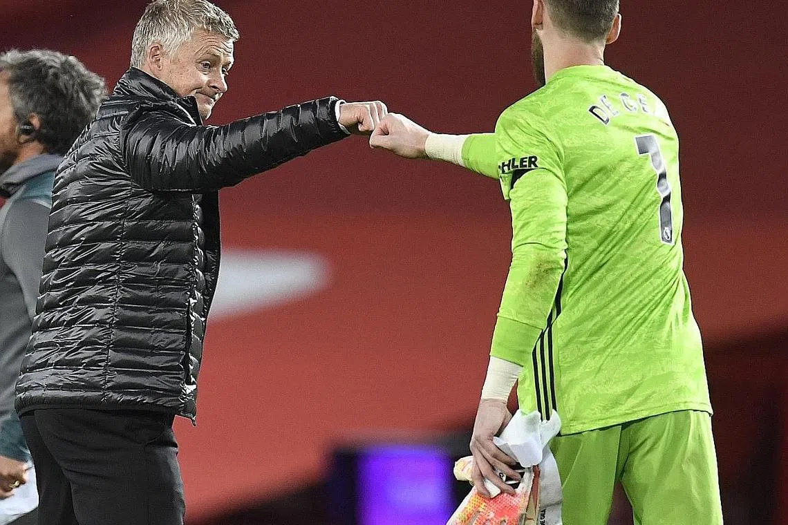 TETAP YAKIN: Pengurus Manchester United, Ole Gunnar Solskjaer (kiri) bersama David de Gea di akhir perlawanan antara Manchester United dan Southampton FC. - Foto EPA-EFE -