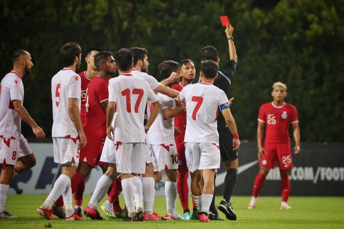 Di Stadium Bishan pada Jumaat, Singapura, yang dikurangkan kepada 10 pemain, tewas 0-2 di tangan Tajikistan dalam satu perlawanan persahabatan antarabangsa.