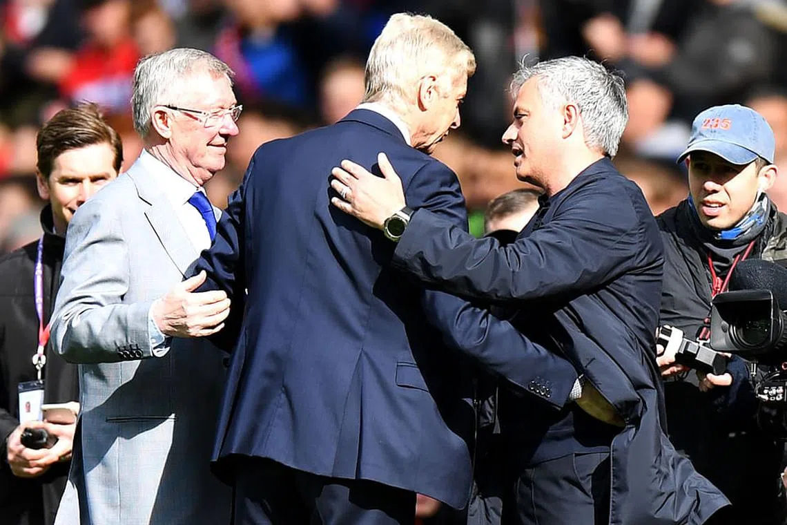 KETEPI PERMUSUHAN: Pengurus Arsenal, Arsene Wenger (tengah) diapit rakan sejawatannya daripada United, Jose Mourinho (kanan), dan bekas bos United, Sir Alex Ferguson (kiri) sebelum permulaan perlawanan antara United dengan Arsenal di Old Trafford kelmarin. - Foto AFP -