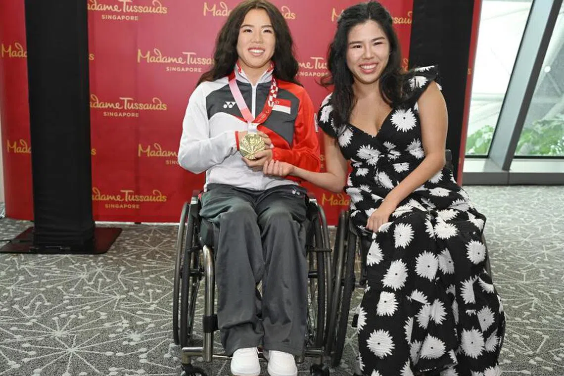 Perenang para Singapura, Yip Pin Xiu (kanan), bersama patung lilinnya, yang dipamerkan di Muzium Madame Tussauds Singapura. - Foto ST