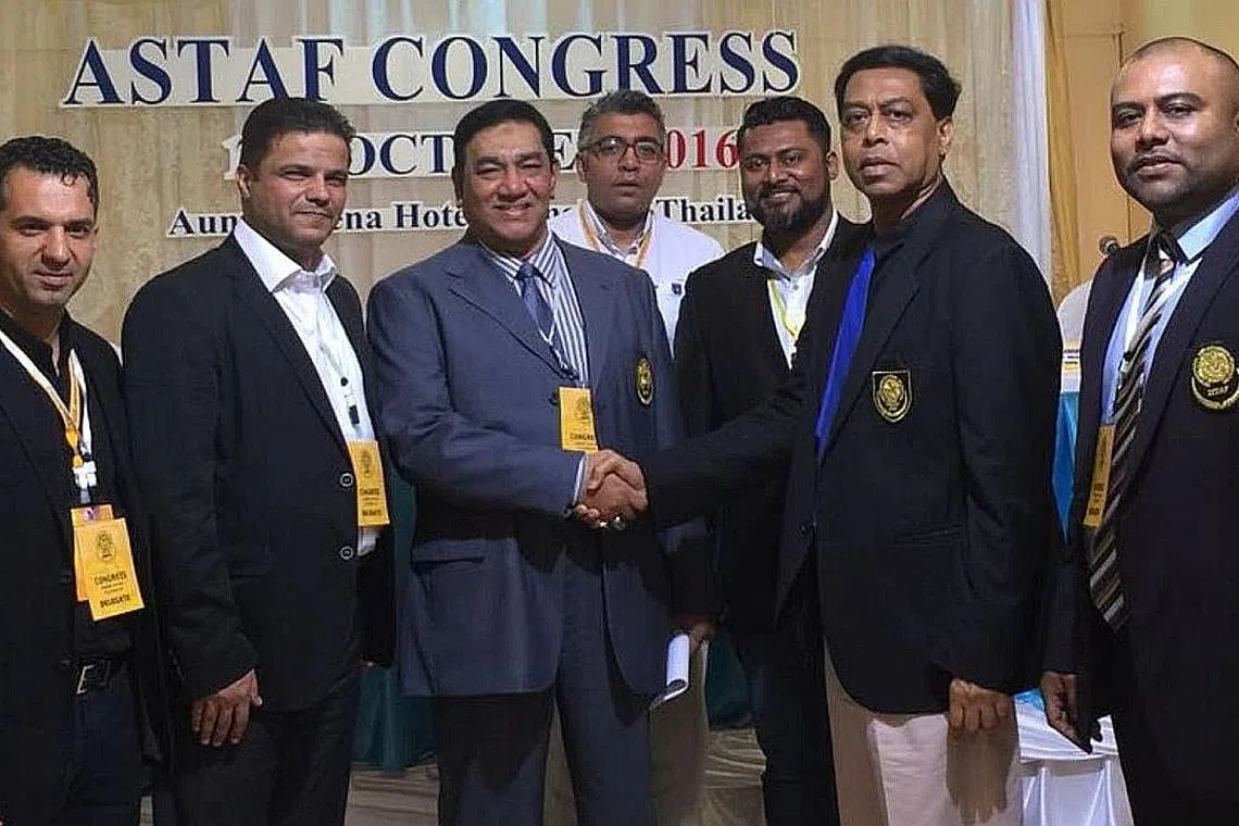 DIPILIH SEMULA TERAJUI ASTAF: Presiden Persatuan Sepak Takraw Malaysia, Datuk Ahmad Ismail (tiga dari kiri), berjabat tangan dengan Abdul Halim Kader yang dipilih semula sebagai Presiden Astaf dalam kongres persekutuan itu di Bangkok Khamis lalu. Datuk Ahmad dipilih menjadi salah seorang daripada dua timbalannya. - Foto ASTAF -