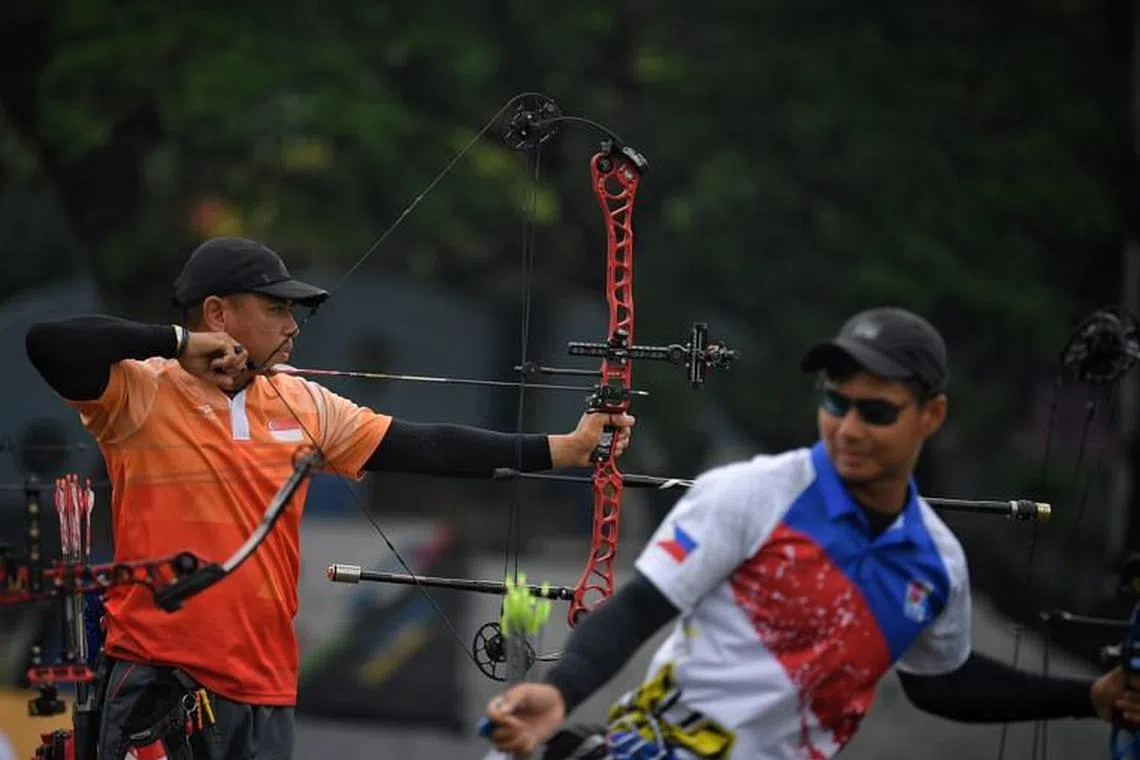 Singapura memenangi pingat pertama dalam temasya Sukan SEA ke-29 melalui sukan memanah apabila skuad pemanah negara Ang Han Teng, Alan Lee dan Pang Toh Jin memungut pingat perak dalam acara kompaun lelaki tadi pagi.