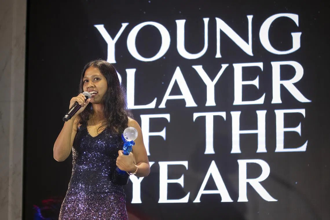 Tersenyum lebar dengan gaun bermanik yang berkilauan seperti bakatnya, Dhaniyah, 19 tahun, naik ke pentas untuk menerima anugerah Pemain Muda Terbaik 2023.