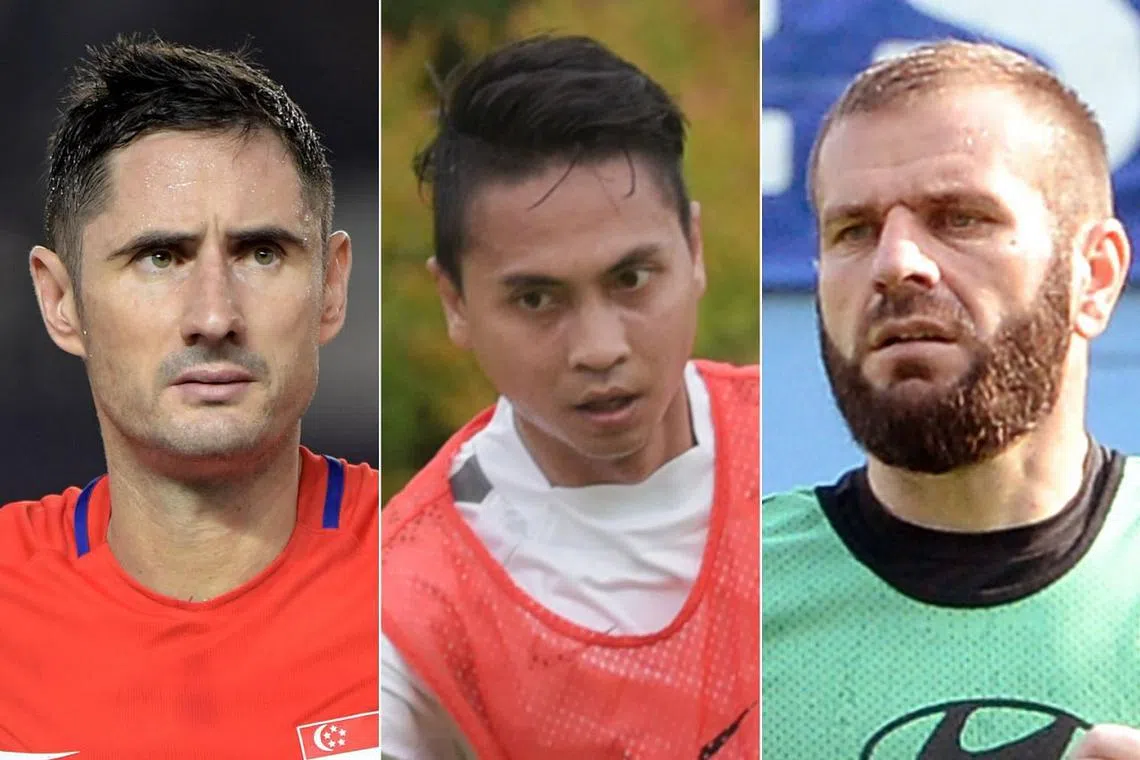 BERPENGALAMAN: (Dari kiri) Bennett, Shahril dan Mustafic merupakan antara pemain paling berpengalaman bola sepak Singapura dan telah bermain dalam pertandingan besar sebelum ini. - Foto-foto fail -