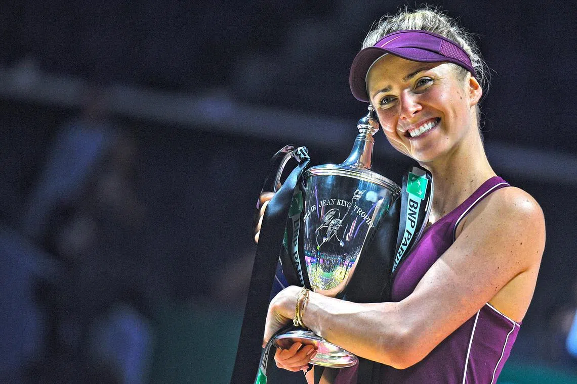 JUARA BARU: Svitolina memeluk trofinya selepas menewaskan Sloane Stephens 3-6, 6-2, 6-2, ketika perlawanan Final WTA BNP Paribas Singapura yang disampaikan SC Goba malam kelmarin. - Foto BH oleh MARK CHEONG -