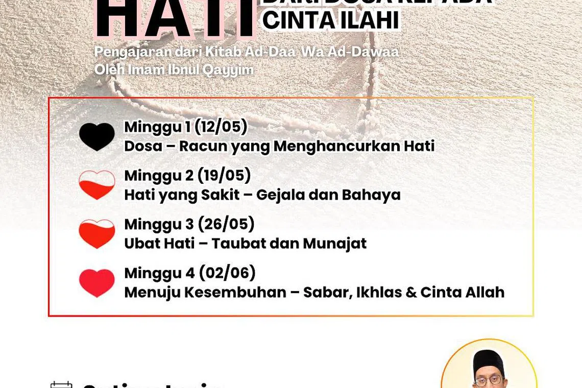 Sertai kelas modular masjid Al-Khair dalam siri pengajian istimewa ‘Transformasi Hati: Dari Dosa kepada Cinta Ilahi’ bersama Ustaz Faizuddin Fauzan berdasarkan kitab Ad-Daa’ wa Ad-Dawaa’ oleh Imam Ibnul Qayyim. - Foto MASJID AL-KHAIR