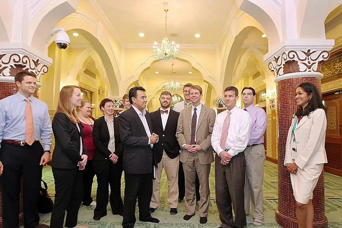 TERIMA KUNJUNGAN: Ustaz Dr Mohamed Ali (lima dari kiri) memberikan taklimat kepada sekumpulan pengunjung dari Amerika Syarikat di Masjid Khadijah. - Foto fail -