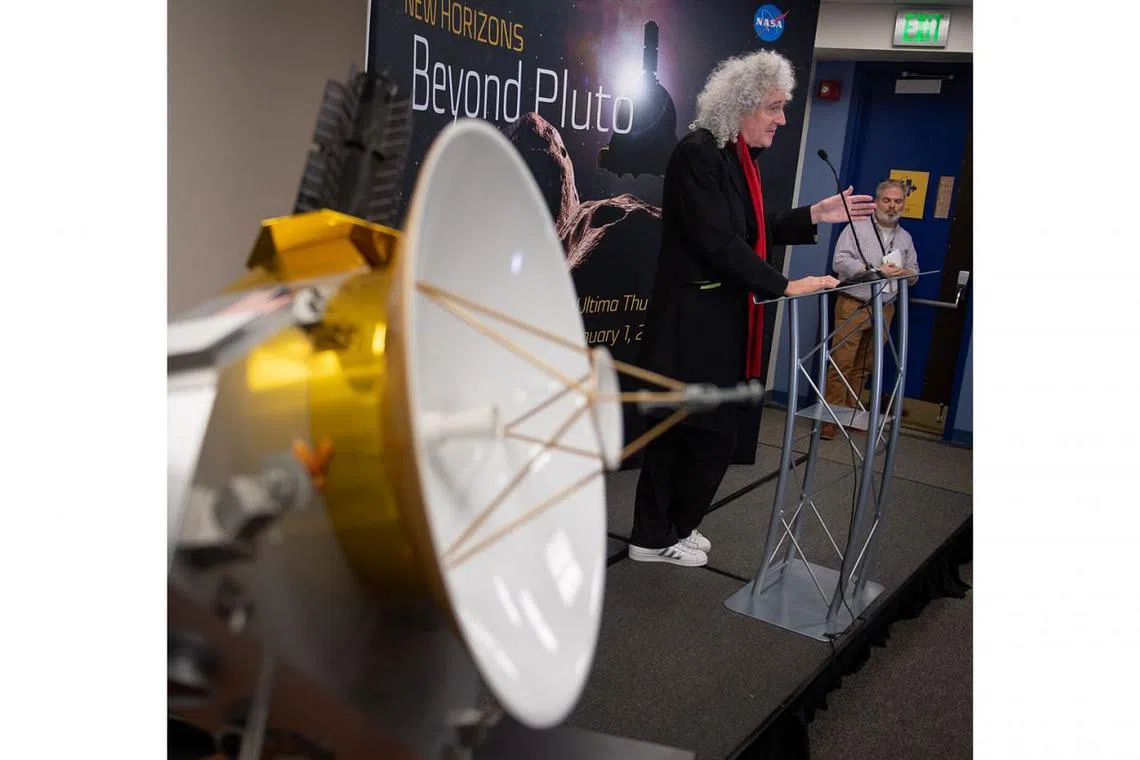 PENEROKAAN ANGKASA LEPAS: Pakar astrofizik, Brian May, yang juga merupakan pemain gitar bagi kugiran rok British, Queen, membincangkan laluan kapal angkasa 'New Horizon' di kawasan Kuiper Belt, di Makmal Fizik Gunaan di Universiti John Hopkins, di Maryland, Amerika Syarikat, pada 31 Disember lalu. - Foto EPA-EFE -