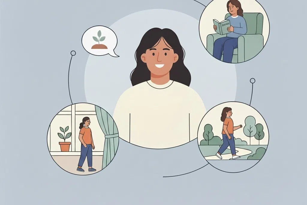 Ini termasuk mendapatkan tidur yang secukupnya; bersenam; makan makanan yang sihat, habis membaca buku yang sudah lama ditangguhkan; mengemas kabinet atau laci yang berselerak; mengetepikan masa untuk penjagaan diri; bahkan berborak dengan orang tersayang.