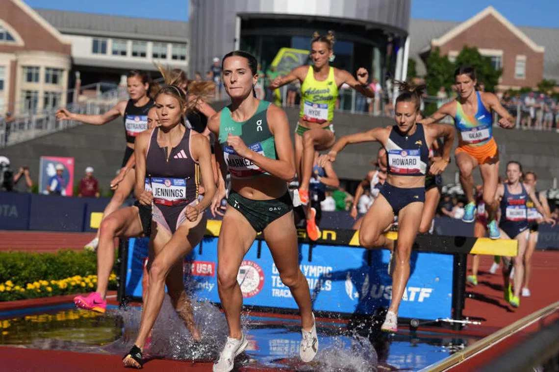 Atlet yang bertanding dalam acara lari berhalangan wanita semasa Percubaan Olimpik Pasukan Amerika Syarikat di Hayward Field pada 24 Jun. - Foto REUTERS