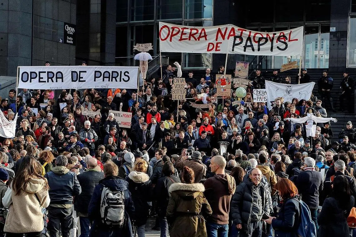 SUARA BANTAHAN: Puluhan ribu warga Perancis berkumpul di Paris menerusi mogok seluruh negara bagi menyuarakan bantahan terhadap rancangan pemerintah mahu merubah sistem persaraan negara itu. - Foto AFP -